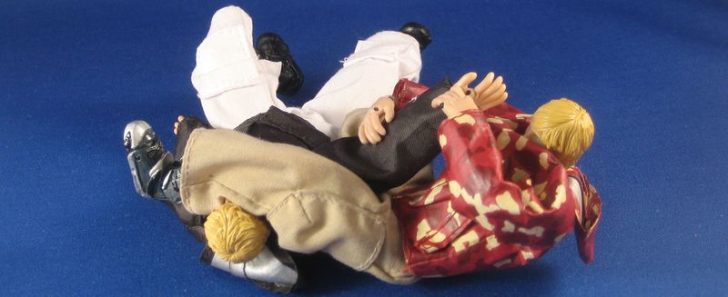 While pulling Noob’s right arm toward the mat in a big circle and simultaneously lifting up with his hooked right leg, Boarder is able to make Noob fall forward…